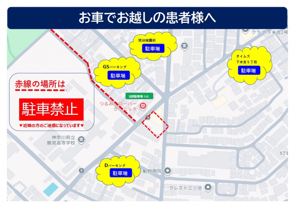 当院の駐車場ではございません。絶対に駐車しないようお願いいたします。
